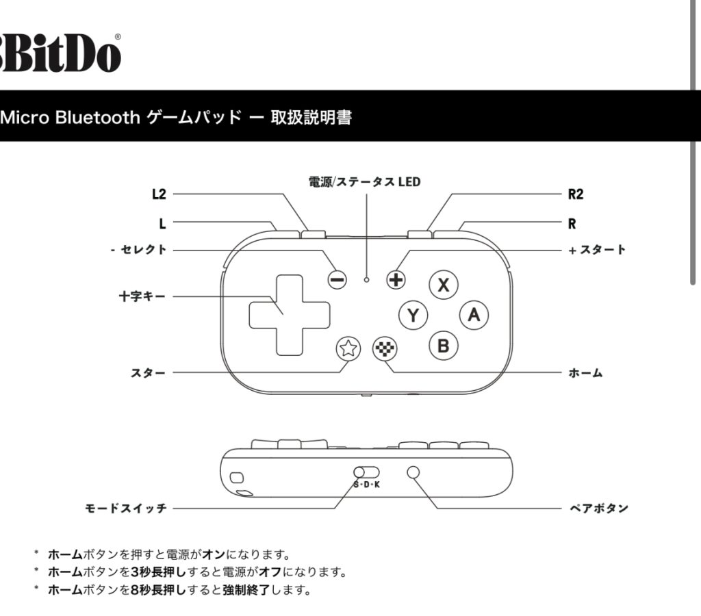 なお、本機はスリープ機能があり、ペアリングボタンを一度押すとスリープ状態に移行し、スリープ状態のときにホームボタンを押すと復帰します。また、十字キーは左右のスティックとして動作させることもできて、マイナスボタンと、十字キーの上、左、右のいずれかを押すことで、十字キー、左スティック、右スティックモードを切り替えることができます。