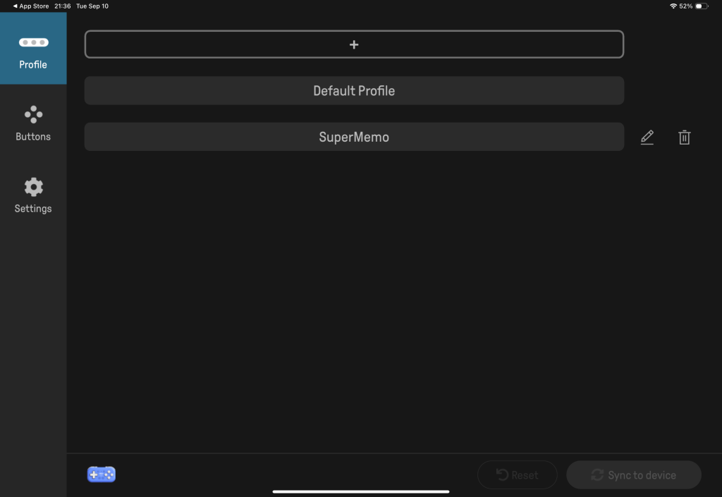 アプリを起動して接続が確立すると、プロファイルやボタン配列などを設定できるようになりますプロファイルの編集画面は下の通りです。新しいプロファイルを作成するときは+ボタンを押して適当な名前を入力します。