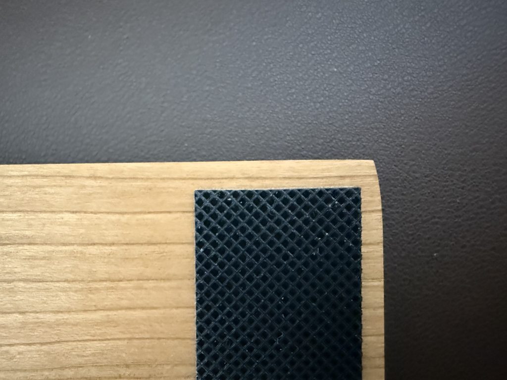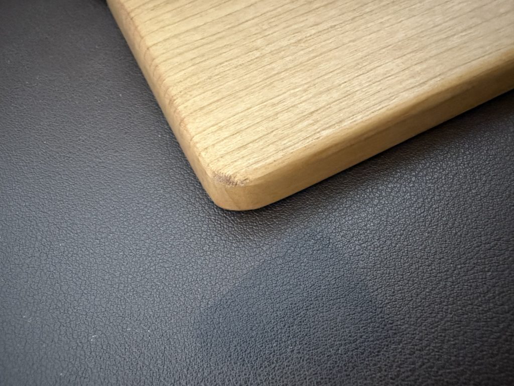 木目の節には若干の凹凸が残っていましたが、常時手が当たる部分であっても気になるほどではありませんでした。ただ、左下の角のヤスリがけが甘く、触るとザラザラしており、このあたりは値段なり品質だと感じました。
